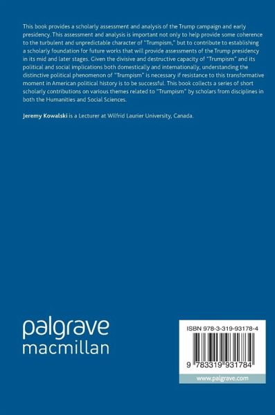This book provides a scholarly assessment and analysis of the Trump campaign and early presidency. This assessment and analysis is important not only to help provide some coherence to the turbulent and unpredictable character of "Trumpism," but to contribute to establishing a scholarly foundation for future works that will provide assessments of the Trump presidency in its mid and later stages. Given the divisive and destructive capacity of "Trumpism" and its political and social implications both domestically and internationally, understanding the distinctive political phenomenon of "Trumpism" is necessary if resistance to this transformative moment in American political history is to be successful. This book collects a series of short scholarly contributions on various themes related to "Trumpism" by scholars from disciplines in both the Humanities and Social Sciences.