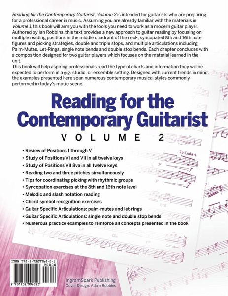 Reading for the Contemporary Guitarist, Volume 2 is intended for guitarists who are preparing for a professional career in music. Assuming you are already familiar with the materials in Volume 1, this book will arm you with the tools you need to work as a modern guitar player. Authored by Ian Robbins, this text provides a new approach to guitar reading by focusing on multiple reading positions in the middle quadrant of the neck, syncopated 8th and 16th note figures and picking strategies, double and triple stops, and multiple articulations including Palm-Mutes, Let-Rings, single note bends and double stop bends. Each chapter concludes with a composition designed for two guitar players which focuses on the material learned in the unit. This book will help aspiring professionals read the type of charts and information they will be expected to perform in a gig, studio, or ensemble setting. Designed with current trends in mind, the examples presented here span numerous contemporary musical styles commonly performed in today's music scene.