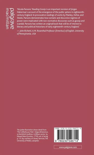 'Nicola Parsons' Reading Gossip is an important revision of Jürgen Habermas's account of the emergence of the public sphere in eighteenth-century England. In provocative readings of works by Manley, Defoe, and Steele, Parsons demonstrates how somatic and discursive regimes of power were implicated with non-normative discourses such as gossip and scandal. Parsons has written an original book that will be of interest to literary and political historians of early eighteenth-century England.' - John Richetti, A.M. Rosenthal Professor (Emeritus) of English, University of Pennsylvania, USA