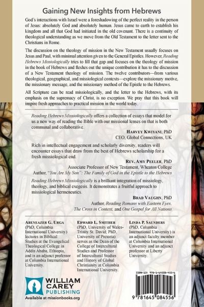 Gaining New Insights from Hebrews God's interactions with Israel were a foreshadowing of the perfect reality in the person of Jesus: absolutely God and absolutely human. Jesus came to earth to establish his kingdom and all that God had initiated in the old covenant. There is a continuity of theological understanding as we move from the Old Testament to the letter sent to the Christians in Rome. The discussion on the theology of mission in the New Testament usually focuses on Jesus and Paul, with minimal attention given to the General Epistles. However, Reading Hebrews Missiologically tries to fill that gap and focuses on the theology of mission in the book of Hebrews and fleshes out the unique contribution it has to the discussion of a New Testament theology of mission. The twelve contributors-from various theological, geographical, and missiological contexts-explore the missionary motive, the missionary message, and the missionary method of the Epistle to the Hebrews. All Scripture can be read missiologically, and the letter to the Hebrews, with its emphasis on the supremacy of Christ, is no exception. We pray that this book will inspire fresh approaches to practical mission in the world today.