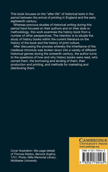 This book focuses on the "after-life" of historical texts in the period between the arrival of printing in England and the early eighteenth century. Whereas previous studies of historical writing during this period have focused on their authors and on their style or methodology, this work examines the social forces that controlled what was written, and the impact of readers and publishers on authors. The intent is to situate the study of history books within the current literature on the history of the book and the history of print culture.