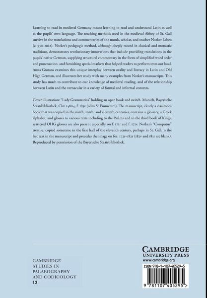 Learning to read in medieval Germany meant learning to read and understand Latin as well as the pupils' own language. The teaching methods used in the medieval Abbey of St Gall survive in the translations and commentaries of the monk, scholar and teacher Notker Labeo (c.950-1022). Notker's pedagogic method, although deeply rooted in classical and monastic traditions, demonstrates revolutionary innovations that include providing translations in the pupils' native German, supplying structural commentary in the form of simplified word order and punctuation, and furnishing special markers that helped readers to perform texts out loud. Anna Grotans examines this unique interplay between orality and literacy in Latin and Old High German, and illustrates her study with many examples from Notker's manuscripts. This study has much to contribute to our knowledge of medieval reading, and of the relationship between Latin and the vernacular in a variety of formal and informal contexts.