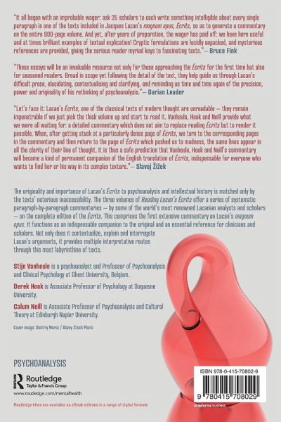Introduction to 'Reading Lacan's Écrits': La trahison de l'écriture - Derek Hook, Calum Neill & Stijn Vanheule 1. The Signification of the Phallus -Todd McGowan 2. In Memory of Ernest Jones: On His Theory of Symbolism - Filip Geerardyn and Alain Pringels 3. On An Ex Post Facto Syllabary -Yael Goldman Baldwin 4. Some Guiding Remarks for a Convention on Female Sexuality - Eve Watson 5. The Youth of Gide, or the Letter and Desire - Jean-Michel Rabaté 6. Kant with Sade - Dany Nobus 7. The Subversion of the Subject and the Dialectic of Desire in the Freudian Unconscious - Fabio Vighi 8. Position of the Unconscious - Paul Verhaeghe 9. On Freud's "Trieb" and the Psychoanalyst's Desire - Theo Reeves-Evison 10. Science and Truth - Ed Pluth 11. Metaphor of the Subject - Stephanie Swales