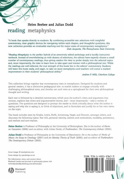 "Reading Metaphysics is the perfect hybrid of anattentively edited anthology and a lucidly instructive textbook.Instead of overwhelming us with dozens of selections, the editorshave expertly chosen a small number of contemporary readings, thusgiving readers the time to probe deeply into the selected topicsand, more importantly, the time to learn how to take apart andinteract with a philosophical text. While the readings arewell-selected, the true strength of this book lies in theeditors' commentary. Students will leave this book ready, andeager, to take on more metaphysics and teachers will notice amarked improvement in their students' philosophicalability."