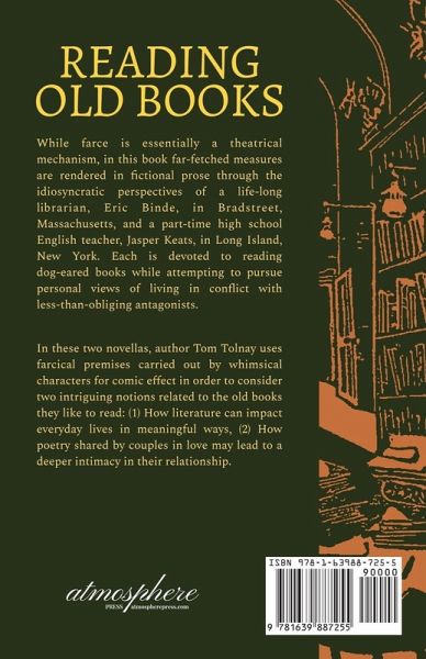 While farce is essentially a theatrical mechanism, in this book far-fetched measures are rendered in fictional prose through the idiosyncratic perspectives of a life-long librarian, Eric Binde, in Bradstreet, Massachusetts, and a part-time high school English teacher, Jasper Keats, in Long Island, New York. Each is devoted to reading dog-eared books while attempting to pursue personal views of living in conflict with less-than-obliging antagonists. In these two novellas, author Tom Tolnay uses farcical premises carried out by whimsical characters for comic effect in order to consider two intriguing notions related to the old books they like to read: (1) How literature can impact everyday lives in meaningful ways, (2) How poetry shared by couples in love may lead to a deeper intimacy in their relationship.