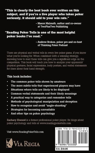 Zachary Elwood's book Reading Poker Tells has been called the best book on the subject of poker behavior by many poker players, both amateur and professional. This is the first book in his poker tells trilogy, following by Verbal Poker Tells (2014) and Exploiting Poker Tells (2017). This book will teach you how professional poker players analyze the facial expressions, body posture, physical gestures, and verbal statements of opponents in a live poker game. More importantly, it will give you a mental framework for thinking about and remembering poker tells by emphasizing how common situations can be similar or can be different (for example, the big difference between a Post-Bet situation and a Waiting-For-Action situation). Reading Poker Tells also contains other tips on general poker psychology, including methods for deceiving and manipulating opponents, and ways to stay "unreadable". Many people have said that the greatest value they got from this book was in being able to eliminate some common tells that they were unknowingly displaying. REVIEWS "Reading Poker Tells is one of the most helpful poker books I've ever read." - Andrew Brokos, pro player, co-host of the Thinking Poker podcast "Reading Poker Tells is far and away the best book on live reads. I recommend it to everyone." - Max Steinberg, pro player, 4th place WSOP Main Event "Elwood has established himself as an authority on poker tells. His book is the current gold standard." - Ed Miller, pro player and poker author