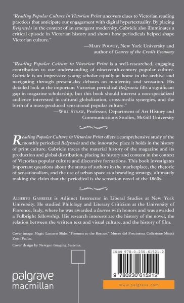 'Reading Popular Culture in Victorian Print uncovers clues to Victorian reading practices that anticipate our engagement with digital hypertextuality. By placing Belgravia in the context of an emergent modernity, Gabriele also illuminates a critical episode in Victorian history and shows how periodicals helped shape Victorian culture.' Mary Poovey, New York University and author of Genres of the Credit Economy'Reading Popular Culture in Victorian Print is a well-researched, engaging contribution to our understanding of nineteenth-century popular culture. Gabriele is an impressive young scholar equallyat home in the archive and navigating throughpresent-day debates on modernity and sensation. His detailed look at the important Victorian periodical Belgravia fills a significant gap in magazine scholarship, but this book should interest a non-specialized audience interested in cultural globalization, cross-media synergies and the birth of a mass-produced sensational popular culture.' Will Straw, Professor, Department of Art History and Communications Studies, McGill University "Gabriele's book is not only a helpful monograph about the monthly Belgravia under the direction of Mary Elizabeth Brandon (1866-1876), it is also and maybe above all a relevant reflection upon the cultural and social power of the periodical press. It shows clearly how the tropes of 'sensationalism' contributed to shaping the new visual, urban and industrial culture the very frame of our modernity." - Dominique Kafila, Professor, University of Paris-Sorbonne and author of L'Encre et le sang