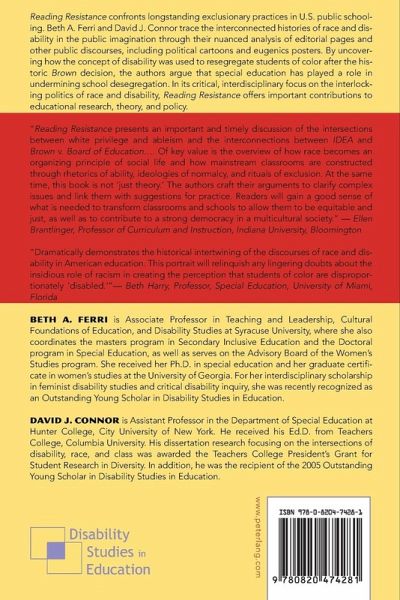Reading Resistance confronts longstanding exclusionary practices in U.S. public schooling. Beth A. Ferri and David J. Connor trace the interconnected histories of race and disability in the public imagination through their nuanced analysis of editorial pages and other public discourses, including political cartoons and eugenics posters. By uncovering how the concept of disability was used to resegregate students of color after the historic Brown decision, the authors argue that special education has played a role in undermining school desegregation. In its critical, interdisciplinary focus on the interlocking politics of race and disability, Reading Resistance offers important contributions to educational research, theory, and policy.
