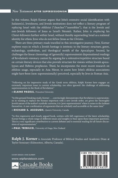 In this volume, Ralph Korner argues that John's extensive social identification with Judaism(s), Jewishness, and Jewish institutions does not reflect a literary program of replacing Israel with the ekkl¿siai (""churches""/""assemblies""), that is the Jewish and non-Jewish followers of Jesus as Israel's Messiah. Rather, John is emplacing his Christ-followers further within Israel, without thereby superseding Israel as a national identity for ethnic Jews who do not follow Jesus as the Christos. There are three primary roads travelled in this investigative journey. First, Korner explores ways in which a Jewish heritage is intrinsic to the literary structure, genre, eschatology, symbolism, and theological motifs of the Apocalypse. Second, he challenges the linear chronology of (generally) supersessionist dispensational readings of Revelation's visionary content by arguing for a reiterative/repetitive structure based on certain literary devices that also provide structure for visions within Jewish apocalypses and Hebrew prophecies. Third, he incorporates the most recent research on ekkl¿sia usage, especially in Asia Minor, to assess how John's ekkl¿sia associations might have been (non-supersessionally) perceived, especially by Jews in Roman Asia.
