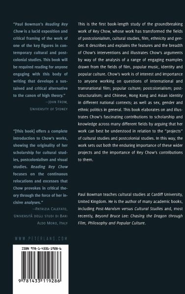 «[This book] offers a complete introduction to Chow's works, showing the originality of her scholarship for cultural studies, postcolonialism and visual studies. Reading Rey Chow focuses on the continuous relocations and excesses that Chow provokes in critical theory through the force of her incisive analyses.» (Patrizia Calefato, Università degli studi di Bari Aldo Moro, Italy)