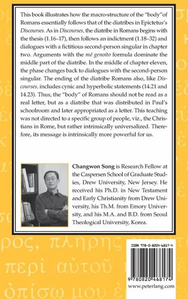 This book illustrates how the macro-structure of the «body» of Romans essentially follows that of the diatribes in Epictetus's Discourses. As in Discourses, the diatribe in Romans begins with the thesis (1.16-17), then follows an indictment (1.18-32) and dialogues with a fictitious second-person singular in chapter two. Arguments with the m genoito formula dominate the middle part of the diatribe. In the middle of chapter eleven, the phase changes back to dialogues with the second-person singular. The ending of the diatribe Romans also, like Discourses, includes cynic and hyperbolic statements (14.21 and 14.23). Thus, the «body» of Romans should not be read as a real letter, but as a diatribe that was distributed in Paul's schoolroom and later appropriated as a letter. This teaching was not directed to a specific group of people, viz., the Christians in Rome, but rather intrinsically universalized. Therefore, its message is intrinsically more powerful for us.