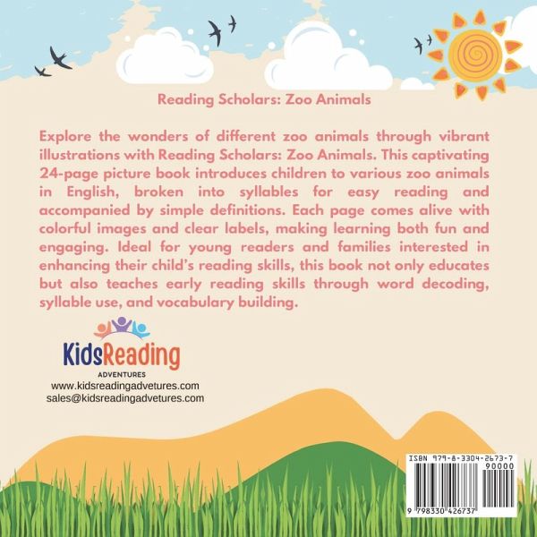Explore the wonders of different zoo animals through vibrant illustrations with Reading Scholars: Zoo Animals. This captivating 24-page picture book, written by Mark Satorre and part of the Reading Scholars book series, introduces children to a variety of fascinating zoo animals. Presented in English with syllables broken down for easy reading, each animal is accompanied by simple definitions to aid comprehension. Every page bursts with colorful, engaging images and clear labels that make learning fun and interactive. Ideal for young readers and families looking to enhance their child's reading skills, this book not only educates but also supports early reading development through word decoding, syllable use, and vocabulary building. Published by Kids Reading Adventures in Las Vegas, Nevada, Reading Scholars: Zoo Animals is designed to inspire a love of reading and learning about the animal kingdom.
