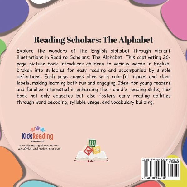 Explore the Wonders of the English Alphabet in Reading Scholars: The Alphabet Dive into the enchanting world of letters with Reading Scholars: The Alphabet, a vibrant 26-page picture book designed to ignite a love for reading in young minds. Authored by Mark Satorre and published by Kids Reading Adventures LLC in Las Vegas, Nevada, this book is a delightful addition to the acclaimed Reading Scholars book series. Each page introduces a letter of the English alphabet, featuring carefully chosen words broken into syllables, making it easy for children to sound out and read. This thoughtful approach not only simplifies the reading process but also enhances phonemic awareness, a crucial skill for early literacy. The pages burst with colorful, captivating illustrations that bring each word to life. From adorable animals to everyday objects, every image is accompanied by clear labels, providing context and helping young readers make connections between words and their meanings. The engaging visuals are designed to hold children's attention and spark their imagination. Reading Scholars: The Alphabet is more than just a fun read; it serves as a powerful educational tool. The book fosters early reading skills through:Word Decoding: Children learn to break down words into manageable syllables. Syllable Usage: By seeing words split into syllables, kids can practice pronunciation and improve their reading fluency. Vocabulary Building: Each word is clearly defined, expanding young readers' understanding of language. Ideal for young readers and families eager to support their child's literacy journey, this book provides a wonderful opportunity for interactive learning. Parents and educators can use it as a springboard for discussions about language and reading, making storytime both fun and enriching. Whether you're introducing your child to the alphabet for the first time or seeking to enhance their reading skills, Reading Scholars: The Alphabet offers a delightful, educational experience. Join Mark Satorre on this colorful journey through the alphabet and watch as your child's confidence in reading flourishes!
