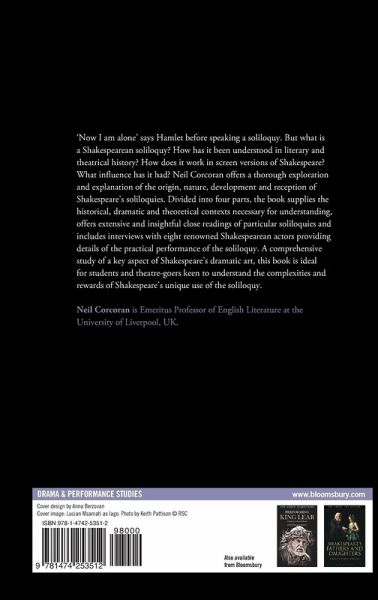 'Now I am alone,' says Hamlet before speaking a soliloquy. But what is a Shakespearean soliloquy? How has it been understood in literary and theatrical history? How does it work in screen versions of Shakespeare? What influence has it had? Neil Corcoran offers a thorough exploration and explanation of the origin, nature, development and reception of Shakespeare's soliloquies. Divided into four parts, the book supplies the historical, dramatic and theoretical contexts necessary to understanding, offers extensive and insightful close readings of particular soliloquies and includes interviews with eight renowned Shakespearean actors providing details of the practical performance of the soliloquy. A comprehensive study of a key aspect of Shakespeare's dramatic art, this book is ideal for students and theatre-goers keen to understand the complexities and rewards of Shakespeare's unique use of the soliloquy.