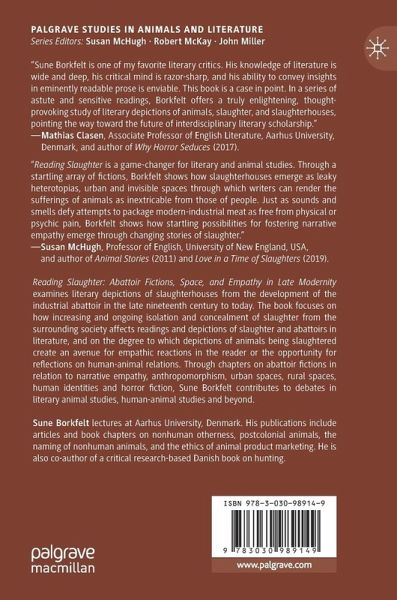 Reading Slaughter: Abattoir Fictions, Space, and Empathy in Late Modernity examines literary depictions of slaughterhouses from the development of the industrial abattoir in the late nineteenth century to today. The book focuses on how increasing and ongoing isolation and concealment of slaughter from the surrounding society affects readings and depictions of slaughter and abattoirs in literature, and on the degree to which depictions of animals being slaughtered creates an avenue for empathic reactions in the reader or the opportunity for reflections on human-animal relations. Through chapters on abattoir fictions in relation to narrative empathy, anthropomorphism, urban spaces, rural spaces, human identities and horror fiction, Sune Borkfelt contributes to debates in literary animal studies, human-animal studies and beyond.