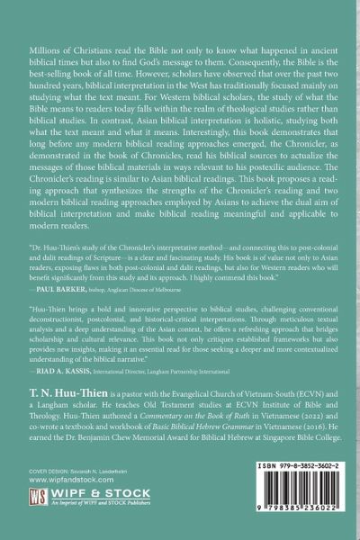 Millions of Christians read the Bible not only to know what happened in ancient biblical times but also to find God's message to them. Consequently, the Bible is the best-selling book of all time. However, scholars have observed that over the past two hundred years, biblical interpretation in the West has traditionally focused mainly on studying what the text meant. For Western biblical scholars, the study of what the Bible means to readers today falls within the realm of theological studies rather than biblical studies. In contrast, Asian biblical interpretation is holistic, studying both what the text meant and what it means. Interestingly, this book demonstrates that long before any modern biblical reading approaches emerged, the Chronicler, as demonstrated in the book of Chronicles, read his biblical sources to actualize the messages of those biblical materials in ways relevant to his postexilic audience. The Chronicler's reading is similar to Asian biblical readings. This book proposes a reading approach that synthesizes the strengths of the Chronicler's reading and two modern biblical reading approaches employed by Asians to achieve the dual aim of biblical interpretation and make biblical reading meaningful and applicable to modern readers.