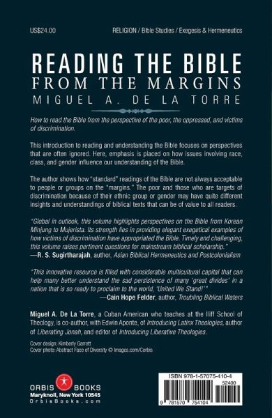 A basic guide to reading the Bible from the perspective of the poor, oppressed, and marginalized. This readable and provocative introduction to hermeneutics emphasizes how issues of race, class, and gender influence our reading and understanding. Reading the Bible from the Margins begins where other texts fail to go: with the perspectives of those who society ignores. De La Torre shows how traditional or standard ways of approaching the Bible can be unacceptable to those who are discriminated against, and that the insights and understandings of biblical texts from the margins are enriching and valuable to all readers.