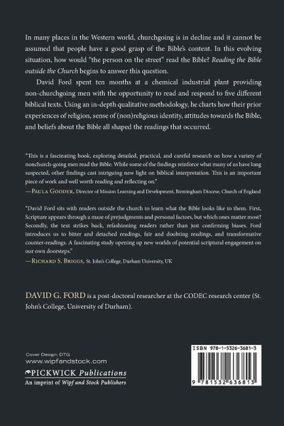 In many places in the Western world, churchgoing is in decline and it cannot be assumed that people have a good grasp of the Bible's content. In this evolving situation, how would ""the person on the street"" read the Bible? Reading the Bible Outside the Church begins to answer this question. David Ford spent ten months at a chemical industrial plant providing non-churchgoing men with the opportunity to read and respond to five different biblical texts. Using an in-depth qualitative methodology, he charts how their prior experiences of religion, sense of (non)religious identity, attitudes towards the Bible, and beliefs about the Bible all shaped the readings that occurred.