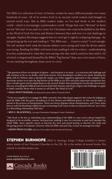 The Bible is a collection of sixty-six books, written by many different people over many thousands of years. All of its writers lived in an ancient-world context and thought in ancient-world ways. But as Bible readers today, we live and think in the modern world--which is increasingly a postmodern world. Things that were ""obvious"" to them are not ""obvious"" to us, and vice versa. For Christians who want to be faithful to the Bible as the Word of God, the time and distance between then and now is a real challenge to navigate. Stephen Burnhope suggests that we won't get it right by collapsing that gap--by just picking the text up and reading it. ""The Bible says . . . [insert a verse]"" is not enough. We will mishear both what the human authors were saying and what the divine author was saying. Reading the Bible well starts from reading it with its writers--understanding it as they understood it: what they were saying; why they said it; and how they said it. All of which is shaped and framed by the Bible's ""big themes"" that, once we're aware of them, we see running throughout, from cover-to-cover.