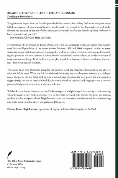 Heginbotham's book focuses on Emily Dickinson's work as a deliberate writer and editor. The fascicles were forty small portfolios of her poems written between 1856 and 1864, composed on four to seven stationery sheets, folded, stacked, and sewn together with twine. What revelations might come from reading her poems in her own context? Are they simply "scrapbooks," as some claim, or are they evidence of conscious, canny editing? Read in their original places, each lyric becomes different-and more interesting-than when read in isolation. We cannot know why Dickinson compiled the books or what she thought of them, but we can observe what she left in them. What she left is visible only by noting the way the poem answers in a dialogue across the pages, the way lines spilling onto a second page introduce the next poem, the way openings suggest image clusters so that each book has its own network of concerns and language-not a story or philosophical preachment but an aesthetic wholeness. This book is the first to demonstrate that Dickinson's poetic and philosophical creativity is most startling when the reader observes the individual lyric in the poet's own, and only, context for them. For teacher, student, scholar, and poetry lover, Heginbotham creates an important new framework for understanding one of the most complex, clever, and profound U.S. poets.