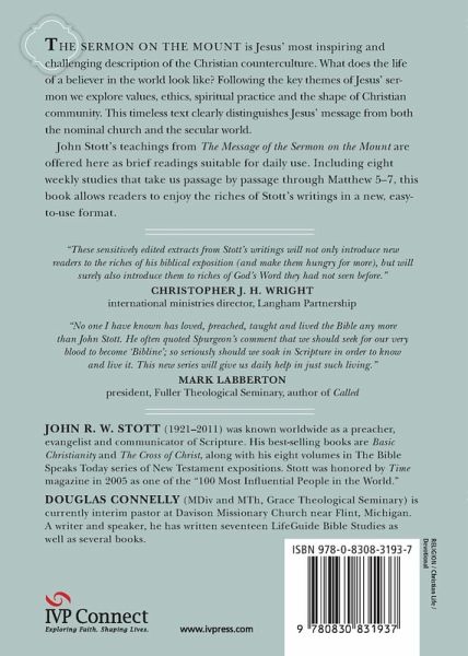 The Sermon on the Mount is Jesus' most inspiring and challenging description of the Christian counterculture. John Stott's teaching on this timeless text shows how its value system, ethical standard, religious devotion and network of relationships clearly distinguish it from both the nominal church and the secular world. In this volume Stott's The Message of the Sermon on the Mount is offered in brief readings suitable for daily use which take us passage by passage through the Scripture text. Including eight weekly studies for individuals or groups, this book covering Matthew 5-7 allows readers to enjoy the riches of Stott's writings in a new, easy-to-use format. John Stott was one of the most beloved and masterful Bible teachers of the last fifty years. His books have sold in the millions. Christians on every continent have heard and read his instructive and inspiring expositions of Scripture. The books in the Reading the Bible with John Stott series offer the essential message of Stott's teaching, largely drawn from his Bible Speaks Today volumes, and present it in a format suitable for daily reading. Questions at the end of each section make these books even more useful for individuals or groups.