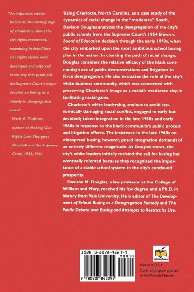 Using Charlotte, North Carolina, as a case study of the dynamics of racial change in the 'moderate' South, Davison Douglas analyzes the desegregation of the city's public schools from the Supreme Court's 1954 Brown v. Board of Education decision through the early 1970s, when the city embarked upon the most ambitious school busing plan in the nation. In charting the path of racial change, Douglas considers the relative efficacy of the black community's use of public demonstrations and litigation to force desegregation. He also evaluates the role of the city's white business community, which was concerned with preserving Charlotte's image as a racially moderate city, in facilitating racial gains. Charlotte's white leadership, anxious to avoid economically damaging racial conflict, engaged in early but decidedly token integration in the late 1950s and early 1960s in response to the black community's public protest and litigation efforts. The insistence in the late 1960s on widespread busing, however, posed integration demands of an entirely different magnitude. As Douglas shows, the city's white leaders initially resisted the call for busing but eventually relented because they recognized the importance of a stable school system to the city's continued prosperity.
