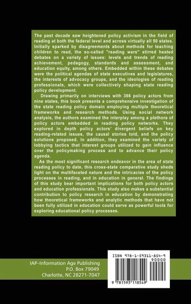 The past decade saw heightened policy activism in the field of reading at both the federal level and across virtually all 50 states. Initially sparked by disagreements about methods for teaching children to read, the so-called "reading wars" stirred heated debates on a variety of issues: levels and trends of reading achievement, pedagogy, standards and assessment, and education equity, among others. Embedded within these debates were the political agendas of state executives and legislatures, the interests of advocacy groups, and the ideologies of reading professionals, which were collectively shaping state reading policy development. Drawing primarily on interviews with 366 policy actors from nine states, this book presents a comprehensive investigation of the state reading policy domain employing multiple theoretical frameworks and research methods. Using social network analysis, the authors examined the interplay among a plethora of policy actors embedded in reading policy networks. They explored in depth policy actors' divergent beliefs on key reading-related issues, the causal stories told, and the policy solutions proposed. In addition, they examined the variety of lobbying tactics that interest groups utilized to gain influence over the policymaking process and to advance their policy agenda. As the most significant research endeavor in the area of state reading policy to date, this cross-state comparative study sheds light on the multifaceted nature and the intricacies of the policy processes in reading, and in education in general. The findings of this study bear important implications for both policy actors and education professionals. This study also makes a substantial contribution to policy research in education by demonstrating how theoretical frameworks and analytic methods that have not been fully utilized in education could serve as powerful tools for exploring educational policy processes.