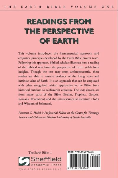 This volume introduces the hermeneutical approach and ecojustice principles developed by the Earth Bible project team. Following this approach, biblical scholars illustrate how a reading of the biblical text from the perspective of Earth yields fresh insights. Though the text may seem anthropocentric, these studies are able to retrieve evidence of the living voice and intrinsic value of Earth. It is an approach that can be harmonized with other recognized critical approaches to the Bible, from historical criticism to ecofeminist criticism. The texts chosen are from many parts of the Bible (Psalms, Prophets, Gospels, Romans, Revelation) and the intertestamental literature (Tobit and Wisdom of Solomon).