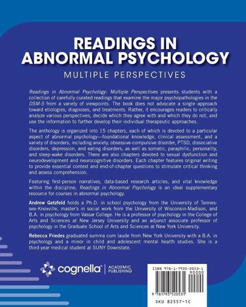 Readings in Abnormal Psychology: Multiple Perspectives presents students with a collection of carefully curated readings that examine the major psychopathologies in the DSM-5 from a variety of viewpoints. The book does not advocate a single approach toward etiologies, diagnoses, and treatments. Rather, it encourages readers to critically analyze various perspectives, decide which they agree with and which they do not, and use the information to further develop their individual therapeutic approaches. The anthology is organized into 15 chapters, each of which is devoted to a particular aspect of abnormal psychology-foundational knowledge, clinical assessment, and a variety of disorders, including anxiety, obsessive-compulsive disorder, PTSD, dissociative disorders, depression, and eating disorders, as well as somatic, paraphilic, personality, and sleep-wake disorders. There are also chapters devoted to sexual dysfunction and neurodevelopment and neurocognitive disorders. Each chapter features original writing to provide essential context and end-of-chapter questions to stimulate critical thinking and assess comprehension. Featuring first-person narratives, data-based research articles, and vital knowledge within the discipline, Readings in Abnormal Psychology is an ideal supplementary resource for courses in abnormal psychology.