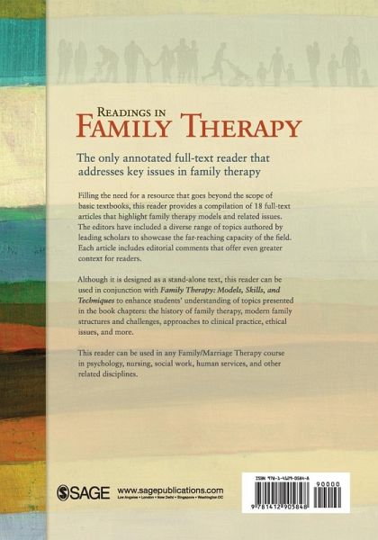 The only annotated full-text reader that addresses key issues in family therapy Filling the need for a resource that goes beyond the scope of basic textbooks, this reader provides a compilation of 18 full-text articles that highlight family therapy models and related issues. The editors have included a diverse range of topics authored by leading scholars to showcase the far-reaching capacity of the field. Each article includes editorial comments that offer even greater context for readers. Although it is designed as a stand-alone text, this reader can be used in conjunction with the upcoming Family Therapy: Models, Skills, and Techniques to enhance students' understanding of topics presented in the book chapters: the history of family therapy, modern family structures and challenges, approaches to clinical practice, ethical issues, and more. This reader can be used in any Family/Marriage Therapy course in psychology, nursing, social work, human services, and other related disciplines.