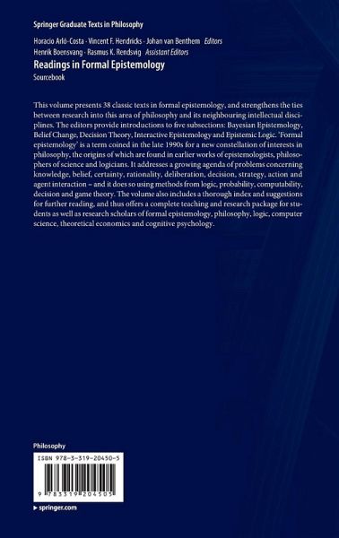Introduction.- 1. Agency and interaction: what we are and what we do in formal epistemology; Jeffrey Helzner and Vincent F. Hendricks.- Part 1. Bayesian Epistemology: Introduction.- 2. Truth and probability; Frank P. Ramsey.- 3. Probable knowledge; Richard C. Jeffrey.- 4. Fine--grained opinion, probability and the logic of full belief; Bas C. van Fraassen.- 5. A theory of higher order probabilities; Haim Gaifman.- 6. On indeterminate probabilities; Isaac Levi.- 6. On indeterminate probabilities; Isaac Levi.- 7. Why I am not a Bayesian; Clark Glymour.- 8. A mistake in dynamic coherence arguments? Brian Skyrms.- 9. Some problems for conditionalization and reflection; Frank Arntzenius.- 10. Stopping to reflect; Mark J. Schervish, Teddy Seidenfeld and Joseph B. Kadane.- Part II. Belief Change: Introduction.- 11. On the logic of theory change: partial meet contraction and revision functions; Carlos Alchourrón, Peter Gärdenfors and David Makinson.- 12. Theory contraction and base contraction unified; Sven Ove Hansson.- 13. How infallible but corrigible full belief is possible; Isaac Levi.- 14. Belief contraction in the context of the General Theory of Rational Choice; Hans Rott.- 15. A survey of ranking theory; Wolfgang Spohn.- Part III. Decision Theory: Introduction.- 16. Allais's Paradox; Leonard Savage.- 17. Decision theory without 'independence' or without 'ordering'; Teddy Seidenfeld.- 18. Ambiguity and the Bayesian paradigm; Itzhak Gilboa and Massimo Marinacci.- 19. State dependent utilities; Mark J. Schervish, Teddy Seidenfeld and Joseph B. Kadane.- 20. Causal decision theory; James M. Joyce and Allan Gibbard.- 21. Advances in prospect theory: cumulative representation of uncertainty; Amos Tversky and Daniel Kahnemann.- Part IV. Logics of Knowledge and Belief: Introduction.- 22. Epistemology without knowledge and without belief; Jaakko Hintikka.- 23. Epistemic operators; Fred Dretske.- 24. Elusive knowledge; David Lewis.- 25. Knowledge and skepticism; RobertNozick.- 26. On logics of knowledge and belief; Robert Stalnaker.- 27. Sentences, belief and logical omniscience, or what does deduction tell us? Rohit Parikh.- 28. The logic of justification; Sergei Artemov.- 29. Learning theory and epistemology; Kevin T. Kelly.- 30. Some computational constraints in epistemic logic; Timothy Williamson.- Part V. Interactive Epistemology: Introduction.- 31. Convention (an excerpt); David Lewis.- 32. Three views of common understanding; Jon Barwise.- 33. The logic of public announcements, common knowledge and private suspicions; Alexandru Baltag, Lawrence S. Moss and Slawomir Solecki.- 34. A qualitative theory of dynamic interactive belief revision; Alexandru Baltag and Sonja Smets.- 35. Agreeing to disagree; Robert J. Aumann.- 36. Epistemic conditions for Nash equilibrium; Robert J. Aumann and Adam Brandenburger.- 37. Knowledge, belief and counterfactual reasoning in games; Robert Stalnaker.- 38. Substantive rationality and backward induction; JosephY. Halpern.