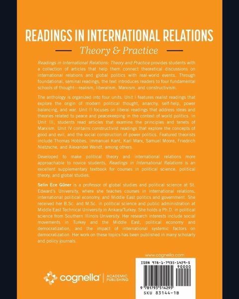 Readings in International Relations: Theory and Practice provides students with a collection of articles that help them connect theoretical discussions on international relations and global politics with real-world events. Through foundational, seminal readings, the text introduces readers to four fundamental schools of thought-realism, liberalism, Marxism, and constructivism. The anthology is organized into four units. Unit I features realist readings that explore the origin of modern political thought, anarchy, self-help, power balancing, and war. Unit II focuses on liberal readings that address ideas and theories related to peace and peacekeeping in the context of world politics. In Unit III, students read articles that examine the principles and tenets of Marxism. Unit IV contains constructivist readings that explore the concepts of good and evil, and the social construction of power politics. Featured theorists include Thomas Hobbes, Immanuel Kant, Karl Marx, Samuel Moore, Friedrich Nietzsche, and Alexander Wendt, among others. Developed to make political theory and international relations more approachable to novice students, Readings in International Relations is an excellent supplementary textbook for courses in political science, political theory, and global studies.