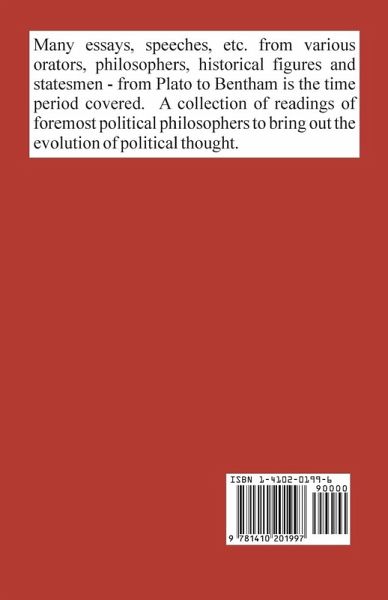 Many essays, speeches, etc. from various orators, philosophers, historical figures and statesmen - from Plato to Bentham is the time period covered. A collection of readings of foremost political philosophers to bring out the evolution of political thought.