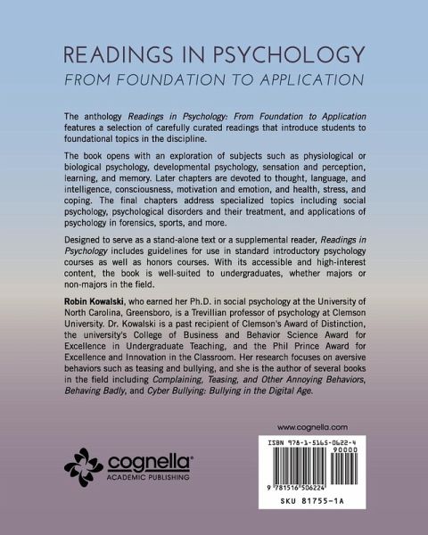 The anthology Readings in Psychology: From Foundation to Application features a selection of carefully curated readings that introduce students to foundational topics in the discipline. The book opens with an exploration of subjects such as physiological or biological psychology, developmental psychology, sensation and perception, learning, and memory. Later chapters are devoted to thought, language, and intelligence, consciousness, motivation and emotion, and health, stress, and coping. The final chapters address specialized topics including social psychology, psychological disorders and their treatment, and applications of psychology in forensics, sports, and more. Designed to serve as a stand-alone text or a supplemental reader, Readings in Psychology includes guidelines for use in standard introductory psychology courses as well as honors courses. With its accessible and high-interest content, the book is well-suited to undergraduates, whether majors or non-majors in the field. Robin Kowalski, who earned her Ph.D. in social psychology at the University of North Carolina, Greensboro, is a Trevillian professor of psychology at Clemson University. Dr. Kowalski is a past recipient of Clemson's Award of Distinction, the university's College of Business and Behavior Science Award for Excellence in Undergraduate Teaching, and the Phil Prince Award for Excellence and Innovation in the Classroom. Her research focuses on aversive behaviors such as teasing and bullying, and she is the author of several books in the field including Complaining, Teasing, and Other Annoying Behaviors, Behaving Badly, and Cyber Bullying: Bullying in the Digital Age.
