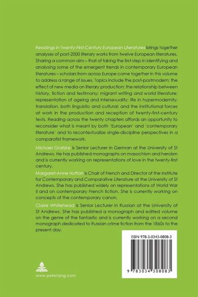 Contents: Camille de Toledo: Zwischen-las-lenguas is where I stand - Margaret-Anne Hutton: Introduction - Kristin Veel: Surveillance Narratives: Overload, Desire and Representation in Contemporary Narrative Fiction - Erika Fülöp: The Blogosphere and the Gutenberg Galaxy and Other Impossible Oppositions: Éric Chevillard's L'Autofictif - Ricardo Fernández Romero: Dirty Metaphysics: The Novels of Pablo Sánchez - Nicolas Dreyer: Contemporary Russian Fiction: insanis, demens et delirans? - Marina Ortrud M. Hertrampf: 'Écrire le réel malade': Régis Jauffret's Shocking Panorama of Contemporary French Society in Microfictions (2007) - Léa Vuong: Pascal Quignard's Metamorphoses: A Contemporary Recuperation of Literary Fairy Tales - Angela Kershaw: Reading Némirovsky Now: Resistant Representations of the Second World War in Twenty-First-Century French Literature - Peter Sjølyst-Jackson: Reframing History: Fiction and Testimony in Roy Jacobsen's The Loggers - Anja Gerigk: Memory Trouble After Post-Histoire: Terézia Mora's Alle Tage - Sven Kramer: Reconsidering 'Heimat': Jenny Erpenbeck's Novel Heimsuchung (2008) - Andrea Gazzoni: Migrant Storytelling: Trauma, History, Stories and Restoration in Cross-Cultural Literature in Contemporary Italy - Nathalie Froloff: A Radical Renewal of the Autobiography in French Contemporary Literature: Ernaux and Carrère - Angelika Baier: Intersections: Hermaphroditism as a 'Travelling Concept' in Ulrike Draesner's Novel Mitgift (2002) - Catherine du Toit: Ageing in the Twenty-First Century - Michèle A. Schaal: The Hypermodern Condition in Isabelle Flükiger's Novels - Christina Chandler Andrews: The Phenomenology of Inter-Subjectivity and Co-Existence in the Post-9/11 World: McEwan's Saturday and Amis's 'The Last Days of Muhammad Atta' - Naòmi Morgan: Translation x 2: Yasmina Reza's Le Dieu du carnage from French to Afrikaans, from Script to Stage - Helen O'Sullivan: Learning Words: Language Learner Narrative in the Twenty-First Century - Gunhild Berg/Rainer Godel: How to Create a Literary Trend, or How to Establish a Winner: An Analysis of the Ingeborg Bachmann Prize 2000-2010 - Sandra Vlasta: 'Literature of Migration': A New Trend in 'Austrian Literature' in the Twenty-First Century?