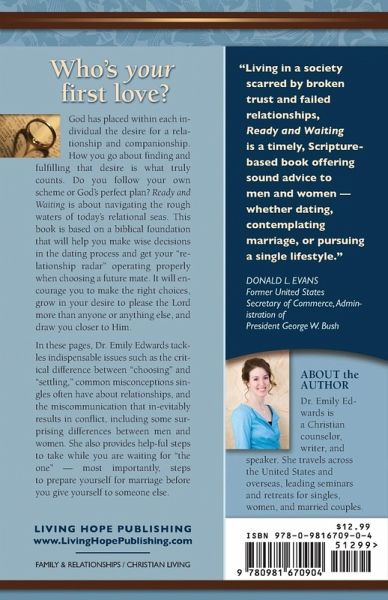 God has placed within each individual the desire for relationship and companionship. How you go about finding and fulfilling that desire is what truly counts. Do you follow your own scheme or God's perfect plan? Ready & Waiting is about navigating the rough waters of today's relational seas. This book is based on a biblical foundation that will help you make wise decisions in the dating process and get your "relationship radar" functioning properly when choosing a future mate. It will encourage you to make the right choices, grow in your desire to please the Lord more than anyone or anything else, and draw you closer to Him.