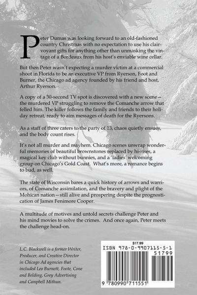 An old fashioned country Christmas is on the menu for Peter. No clairvoyance. No sinister acts. And definitely, no murder. At least that's what he expects as one of the weekend guests at the fabulous Wisconsin estate of Arthur Ryerson--that's Ryerson of the renowned RFB (Ryerson, Foot and Burner) advertising agency in Chicago. Unfortunately, murder and mayhem have a habit of following Peter Dumas. When an Executive VP is murdered in Florida at an RFB shoot for a TV spot, a copy of the commercial is discovered with a deadly new scene. Death is definitely afoot when someone takes deadly aim at the Ryerson family, as the staff caters to twelve guests and one killer. But it's not all murder and mayhem. There's a peek at Christmas in the city as Chicago scenes unwrap wonderful memories of grand greystones, a magical key club without bunnies, and a 'Ladies Welcoming Group in Chicago's Gold Coast . And what's a mystery without a bit of romance in the air? A snow-storm with the state of Wisconsin in its crosshairs hides history under a thick blanket of white; a history of arrows and warriors, Comanches and Mohicans. A multitude of motives and secrets challenge Peter to find the hate that kills. And once again, Peter meets the challenge, head-on.