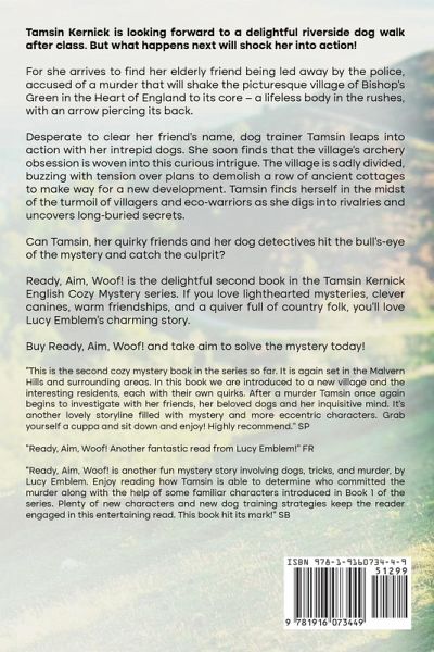 Tamsin Kernick is looking forward to a delightful riverside dog walk after class. But what happens next will shock her into action! For she arrives to find her elderly friend being led away by the police, accused of a murder that will shake the picturesque village of Bishop's Green in the Heart of England to its core - a lifeless body in the rushes, with an arrow piercing its back. Desperate to clear her friend's name, dog trainer Tamsin leaps into action with her intrepid dogs. She soon finds that the village's archery obsession is woven into this curious intrigue. The village is sadly divided, buzzing with tension over plans to demolish a row of ancient cottages to make way for a new development. Tamsin finds herself in the midst of the turmoil of villagers and eco-warriors as she digs into rivalries and uncovers long-buried secrets. Can Tamsin, her quirky friends and her dog detectives hit the bull's-eye of the mystery and catch the culprit? Ready, Aim, Woof! is the delightful second book in the Tamsin Kernick English Cozy Mystery series. If you love lighthearted mysteries, clever canines, warm friendships, and a quiver full of country folk, you'll love Lucy Emblem's charming story. Buy Ready, Aim, Woof! and take aim to solve the mystery today!