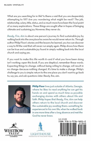 What are you searching for in life? Is there a void that you are desperately attempting to fill? Are you wondering what might be next? The job, relationship, salary, title, status, and so much more have been the focal point of so many explorations. These things are sought after in hopes of bringing ultimate and sustaining joy. However, they never do. Ready, Fire, Aim is about one person's journey to find sustainable joy by walking back into the one place he swore he would never return to. Through author Philip Floor's stories and the lessons he learned, you too can discover a way to fill the void that will never run empty again. Philip shows how there can be true and sustainable joy found in simply walking back into the local church and saying yes. If you want to make this life worth it-and if what you have been doing isn't working-open this book. If you are skeptical, remember these words. Expecting things to change, without being willing to change, will result in no change-because nothing changed. It's time to make a change. Philip's challenge to you is simple: return to the one place you don't want to go back to, say yes, and ask questions later. Ready, fire, aim.