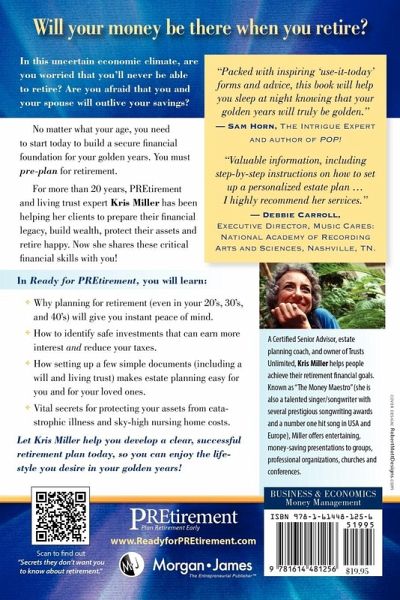 Ready For PREtirement: 3 Secrets for Safe Money and a Fabulous Future is a comprehensive guide to retirement planning. Writing a Will or Living Trust can be scary and confusing, but author Kris Miller breaks down all the big words into easy-to-understand worksheets and tools you can use now. She proves retirement planning is not just for seniors. Miller taps into her vast Estate Planning experience and explains why you should get your financial affairs in order now - even in your 20's, 30’s or 40’s.