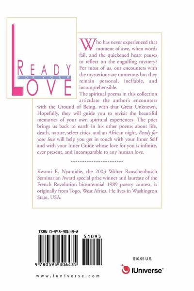 Who has never experienced that moment of awe, when words fail, and the quickened heart pauses to reflect on the engulfing mystery? For most of us, our encounters with the mysterious are numerous but they remain personal, ineffable, and incomprehensible. The spiritual poems in this collection articulate the author's encounters with the Ground of Being, with that Great Unknown. Hopefully, they will guide you to revisit the beautiful memories of your own spiritual experiences. The poet brings us back to earth in his other poems about life, death, nature, select cities, and an African night. Ready for your love will help you get in touch with your Inner Self and with your Inner Guide whose love for you is infinite, ever present, and incomparable to any human love.