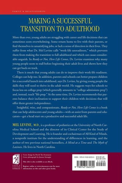 MAKING A SUCCESSFUL TRANSITION TO ADULTHOOD More than ever, young adults are struggling with career and life decisions that can sometimes seem overwhelming. Some return home to live with their parents, or find themselves in unsatisfying jobs, or lack a sense of direction in their lives. They suffer from what Dr. Mel Levine calls "work-life unreadiness," which prevents them from making the transition to full adulthood and which can cause considerable anguish. In "Ready or Not, Here Life Comes, "Dr. Levine examines why many young people seem to stall before beginning their adult lives and shows how they can get back on track. There is much that young adults can do to improve their work-life readiness. Colleges can help too. In addition, parents and schools can better prepare children for a successful launch into adulthood, says Dr. Levine, by giving young people the skills they will need to thrive in the adult world. He suggests ways for schools to focus less on college prep (which generally amounts to "college admissions prep") and, instead, teach "life prep." At the same time, Dr. Levine recommends that parents balance their inclination to support their children with decisions that will offer them greater independence. Insightful, wise, and compassionate, "Ready or Not, Here Life Comes" is a book that can help adolescents and young adults -- with an assist from parents and educators -- get a head start on a productive and successful adult life.