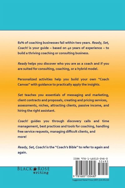 82% of coaching businesses fail within two years. Ready, Set, Coach! is your guide - based on 40 years of experience - to build a thriving coaching or consulting business. Ready helps you discover who you are as a coach and if you are suited for consulting, coaching, or a hybrid model. Personalized activities help you build your own "Coach Canvas" with guidance to practically apply the insights. Set teaches you essentials of messaging and marketing, client contracts and proposals, creating and pricing services, assessments, niches, attracting clients, passive income, and hiring the right assistant. Coach! guides you through discovery calls and time management, best practices and tools for coaching, handling free service requests, managing difficult clients, and more! Ready, Set, Coach! is the "Coach's Bible" to refer to again and again.