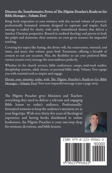 Discover the Transformative Power of The Pilgrim Preacher's Ready-to-Go Bible Messages - Volume Two! Bring fresh inspiration to your ministry with this second volume of practical, professionally formatted sermons designed to captivate and inspire. Each message is crafted for clarity, with easily remembered themes that deliver a timeless Christian perspective. Rooted in credited theology and proven in both the pulpit and classroom, these sermons are your go-to resource for impactful teaching. The Work has been Done for You! Covering key topics like fasting, the divine will, the resurrection, outreach, end times, and more, this volume spans both Testaments, offering a breadth of content to suit any occasion. Plus, the flexibility to use your preferred Bible version ensures every message fits your audience perfectly. Whether it's for church services, bible conferences, camps, mid-week studies, discipleship sessions, adult classes, or personal bible study, Volume Two equips you with essential tools to inspire and engage. "I have been a minister for eighteen years, and I wish I had come across your outlines from the beginning. There have been times when I have struggled to compile messages, and they have not been as good as yours. I am won over. Be sure, I will be recommending these courses to fellow ministers." G. Muldoon. "I presented your lessons at a recent bible camp, and they went over spectacularly. The ordered outlines are a big help both for me and my audience. A few people responded to the message. I will recommend your courses to other ministers." - M. Anul. Ordained with over thirty-five years of theological experience and with books distributed in online bookstores, the Pilgrim Preacher is your one-stop shop for sermons, bible lessons, devotions, music, and books to read. Elevate your ministry today with The Pilgrim Preacher's Ready-to-Go Bible Messages - Volume Two! Your next impactful message is just a page away.