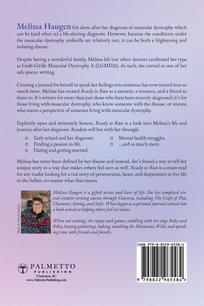 After being diagnosed with muscular dystrophy, Melissa Haugen felt alone. In an effort to make others feel seen, she vulnerably shares her personal story of living with muscular dystrophy. Muscular dystrophy can be (and often is) a life-altering diagnosis. However, because the conditions under the muscular dystrophy umbrella are relatively rare, it can be both a frightening and isolating disease. Melissa felt lost after her diagnosis of Limb Girdle Muscular Dystrophy Type 2A (LGMD2A), despite having a wonderful family. As such, she turned to one of her safe spaces: writing. Creating a journal for herself to speak her feelings into existence has now turned into so much more. Melissa has created Ready to Run as a memoir, a resource, and a friend to listen to. It's written for more than just those who have been recently diagnosed; it's for those living with muscular dystrophy, who know someone with the disease, or anyone who wants a perspective of someone living with muscular dystrophy. Explicitly open and intimately honest, Ready to Run is a look into Melissa's life and journey before and after her diagnosis. Readers will live with her through: Early school and her diagnosis. Finding a passion in life. Dating and getting married. Mental health struggles. ...and so much more. Melissa has never been defined by her disease and instead, she's found a way to tell her unique story in a way that makes others feel seen as well. Ready to Run is a must-read for any reader looking for a real story of perseverance, heart, and desperation to live life to the fullest, no matter what that means.