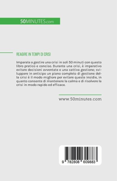 Imparate a gestire una crisi in soli 50 minuti con questo libro pratico e conciso. Durante una crisi, è imperativo evitare decisioni avventate e una cattiva gestione; sviluppare in anticipo un piano completo di gestione della crisi è il modo migliore per evitare queste insidie, in quanto consente di mantenere la calma e di risolvere la crisi in modo rapido ed efficace. Questo libro spiega quali sono i passi da compiere per prepararsi in anticipo alle crisi. Include anche consigli sullo sviluppo di piani di gestione delle crisi e un'introduzione alla comunicazione efficace durante una crisi, fornendo gli strumenti necessari per mantenere l'azienda in carreggiata quando si verificano problemi.