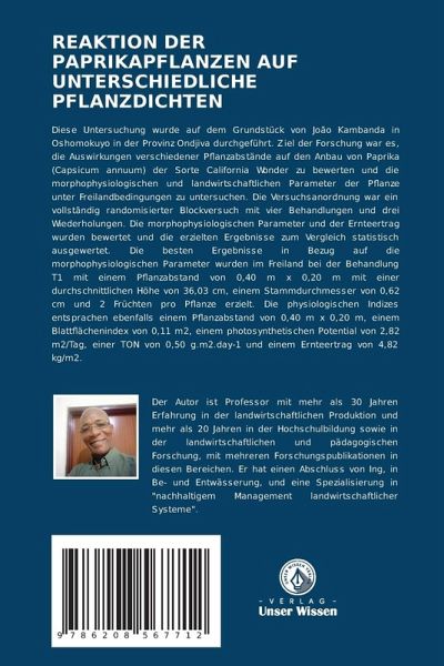 Diese Untersuchung wurde auf dem Grundstück von João Kambanda in Oshomokuyo in der Provinz Ondjiva durchgeführt. Ziel der Forschung war es, die Auswirkungen verschiedener Pflanzabstände auf den Anbau von Paprika (Capsicum annuum) der Sorte California Wonder zu bewerten und die morphophysiologischen und landwirtschaftlichen Parameter der Pflanze unter Freilandbedingungen zu untersuchen. Die Versuchsanordnung war ein vollständig randomisierter Blockversuch mit vier Behandlungen und drei Wiederholungen. Die morphophysiologischen Parameter und der Ernteertrag wurden bewertet und die erzielten Ergebnisse zum Vergleich statistisch ausgewertet. Die besten Ergebnisse in Bezug auf die morphophysiologischen Parameter wurden im Freiland bei der Behandlung T1 mit einem Pflanzabstand von 0,40 m x 0,20 m mit einer durchschnittlichen Höhe von 36,03 cm, einem Stammdurchmesser von 0,62 cm und 2 Früchten pro Pflanze erzielt. Die physiologischen Indizes entsprachen ebenfalls einem Pflanzabstand von0,40 m x 0,20 m, einem Blattflächenindex von 0,11 m2, einem photosynthetischen Potential von 2,82 m2/Tag, einer TON von 0,50 g.m2.day-1 und einem Ernteertrag von 4,82 kg/m2.