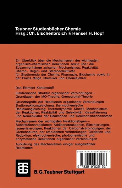 Im diesem Buch wird zuerst die Sonderstellung des Elementes Kohlenstoff begründet. Davon ausgehend werden im Abschnitt 2 die Grundbegriffe der elektronischen Struktur organischer Verbindungen behandelt, soweit sie für das Verständnis von Reaktivität und Selektivität erforderlich sind. Es folgen im Abschnitt 3 die Grundbegriffe der Reaktionen organischer Verbindungen. Im Abschnitt 4, dem Hauptteil des Buches, werden die Mechanismen der wichtigsten Reaktionstypen beschrieben, und zwar: Substitutionsreaktionen, Additionsreaktionen, Eleminierungen, Isomerisierungen, Reaktionen der Carbonylverbindungen mit Nucleophilen, Reaktionen der Carbonsäuren und ihrer Derivate mit Nucleophilen, Reaktionen ambienter Verbindungen, Oxidationen und Reduktionen, elektrochemische, photochemische und enzymatische Reaktionen organischer Verbindungen. Im Abschnitt 5 schließlich wird die Aufklärung des Mechanismus einiger ausgewählter Reaktionen detailliert erläutert.