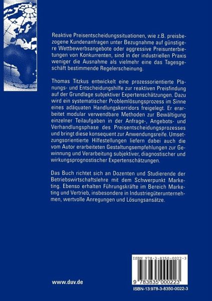 Thomas Titzkus entwickelt eine prozessorientierte Planungs- und Entscheidungshilfe zur reaktiven Preisfindung auf der Grundlage subjektiver Expertenschätzungen. Dazu wird ein systematischer Problemlösungsprozess im Sinne eines adäquaten Handlungskorridors freigelegt. Er erarbeitet modular verwendbare Methoden zur Bewältigung einzelner Teilaufgaben in der Anfrage-, Angebots- und Verhandlungsphase des Preisentscheidungsprozesses und bringt diese konsequent zur Anwendungsreife. Umsetzungsorientierte Hilfestellungen liefern dabei auch die vom Autor erarbeiteten Gestaltungsempfehlungen zur Gewinnung und Verarbeitung subjektiver, diagnostischer und wirkungsprognostischer Expertenschätzungen.