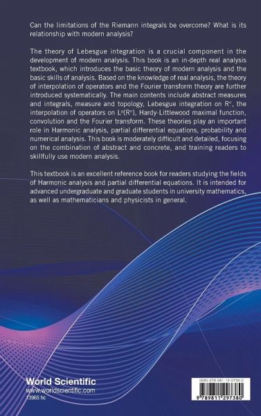 Can the limitations of the Riemann integral be overcome? What is its relationship with modern analysis? The theory of Lebesgue integration is a crucial component in the development of modern analysis. This book is an in-depth real analysis textbook, which introduces the basic theory of modern analysis and the basic skills of analysis. Based on the knowledge of real analysis, the theory of interpolation of operators and the Fourier transform theory are further introduced systematically. The main contents include: abstract measures and integrals, measure and topology, Lebesgue integration on Rn, the interpolation of operators on Lp(Rn), Hardy-Littlewood maximal function, convolution and the Fourier transform. They play an important role in harmonic analysis, partial differential equations, probability and numerical analysis. This book is moderately difficult and detailed, focusing on the combination of abstract and concrete, and training readers to skillfully use modern analysis. This textbook is an excellent reference book for readers studying the fields of Harmonic analysis and partial differential equations. It is intended for advanced undergraduate and graduate students in university mathematics, as well as mathematicians and physicists in general.